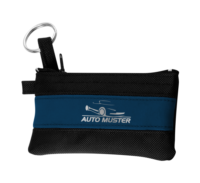 Geräumige Schlüsseltasche aus strapazierfähigem Nylon, gebugt und doppelt abgenäht. Mit Nylonreißverschluss und 30 mm Schlüsselring.